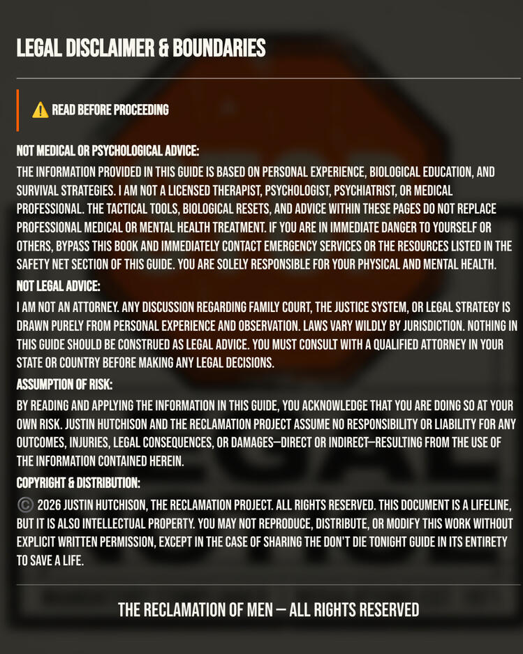 I am Justin Hutchison, the founder of The Reclamation of Men.I didn’t write this from a stage or a comfortable office. I wrote it from the floor of a $50-a-night motel room. After a silver bullet divorce dismantled everything I had built overnight, I spent the last three and a half years fighting for my life, my freedom, and my survival.I am not a therapist. I am not a guru.I am the man who went first—and I am reaching back into the dirt to pull you through.