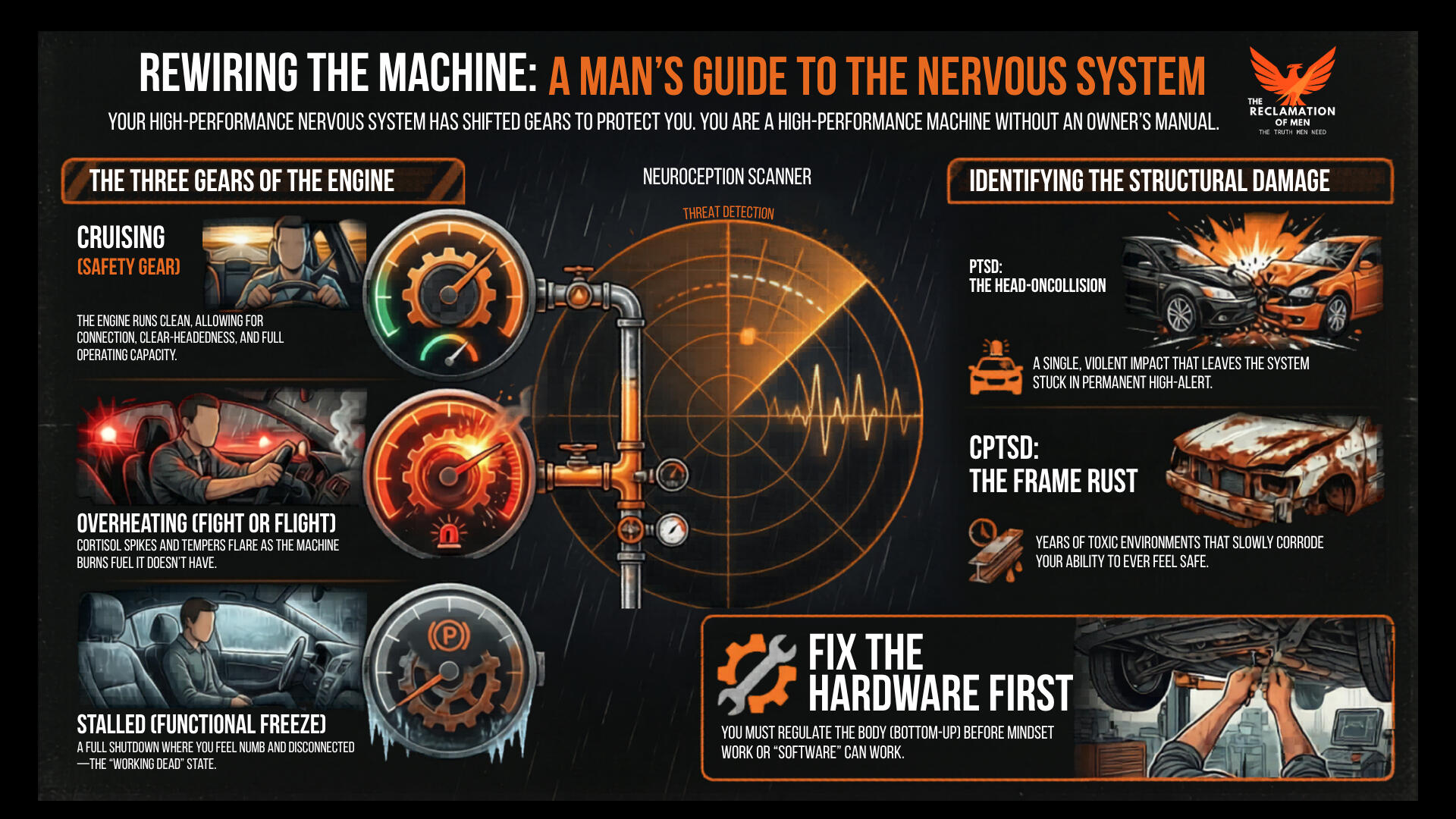 You are a man whose nervous system has been running on fumes for so long it finally locked up — and nobody ever handed you the manual to fix it.